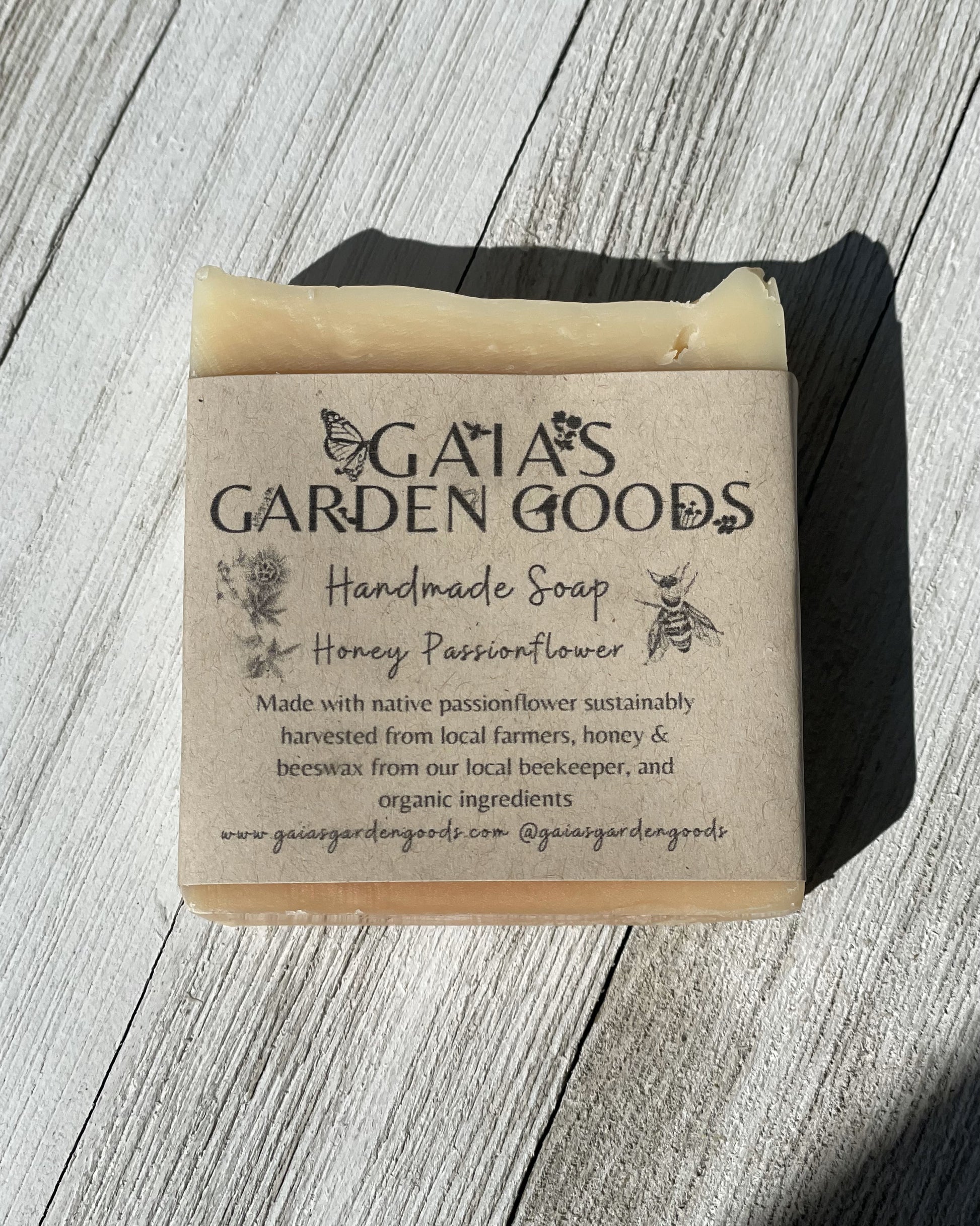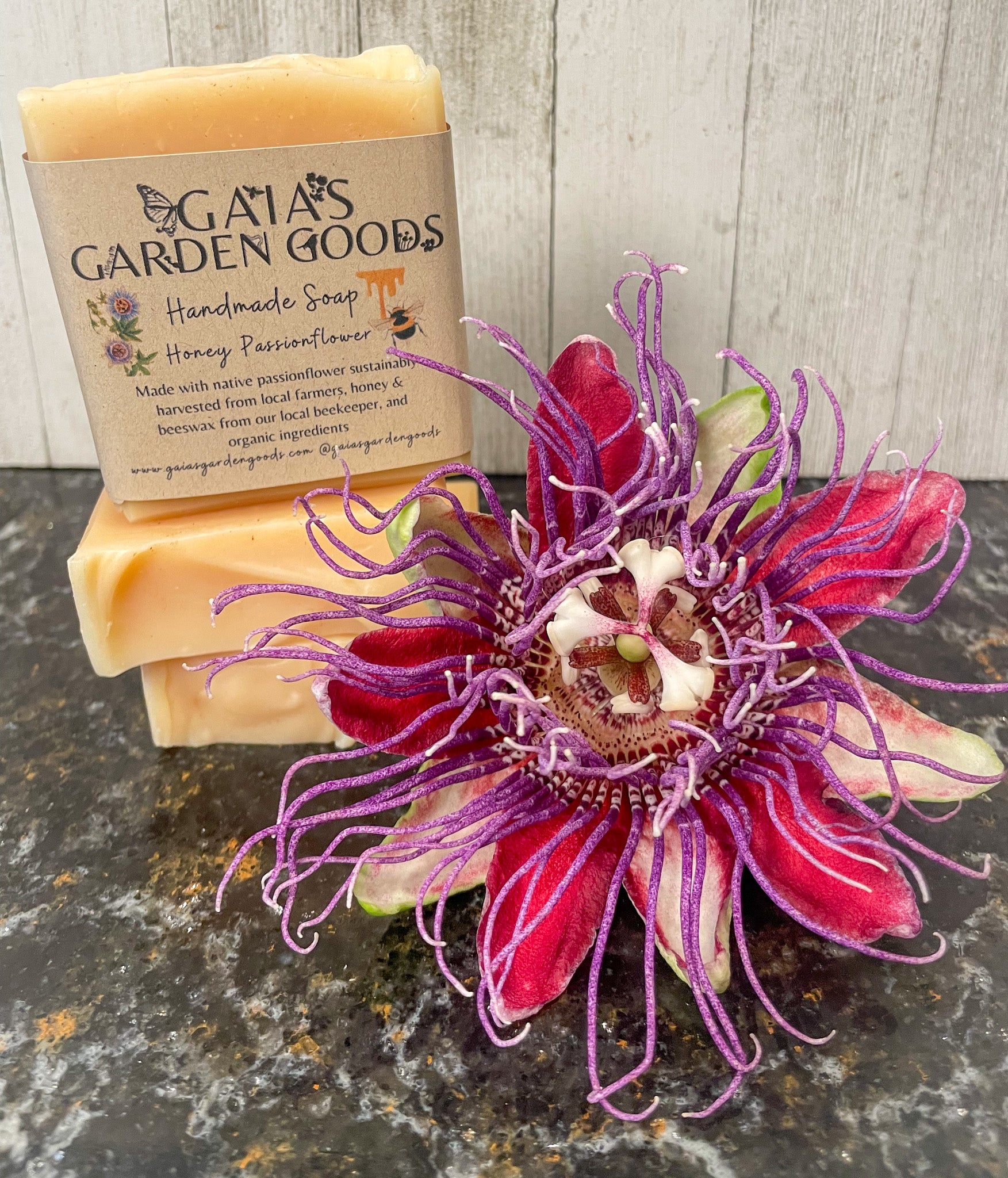Honey Passionflower soap, made with the native plant Purple Passionflower (also known as the Maypop), sustainably harvested by the small, local, regenerative farm The Willow's Gift. Native plants are significantly better at supporting local food webs than non-native plants, which result in environments rich in native plants to have more abundant and healthier ecosystems. At least 7 species of butterflies and moths use this passionflower as a host plant. Many species of birds, mammals, reptiles, beneficial insects and more also rely on the passionflower vine for food and habitat. With this soap, we hope to support farmers who plant native, raise awareness on the importance of native plants for our environment, and support native plant propagation efforts by allocating a portion of every sale to fund additional plantings.