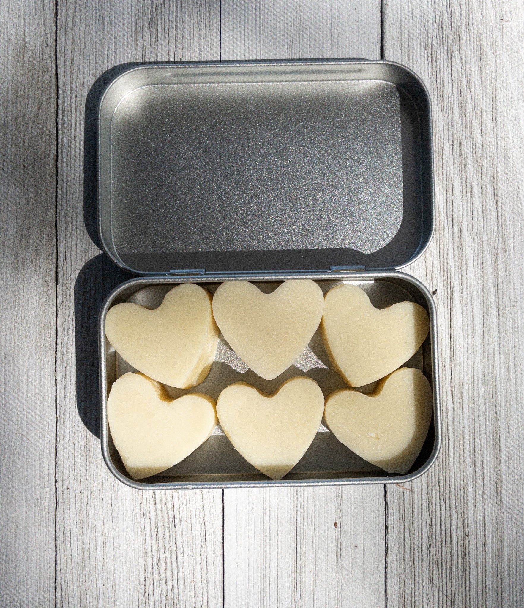 Every order is made fresh to ensure you get the highest quality product every time. Each tin contains 6 heart-shaped massage oil bars.